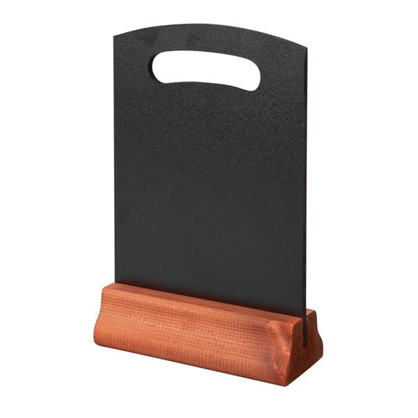 Double-sided, free standing menu board for displaying bar snacks, specials or menus, ideal for use on table tops and bars. Non-porous surface perfect for chalk and liquid chalk pens, with red mahogany finished stand for rustic, homely feel.