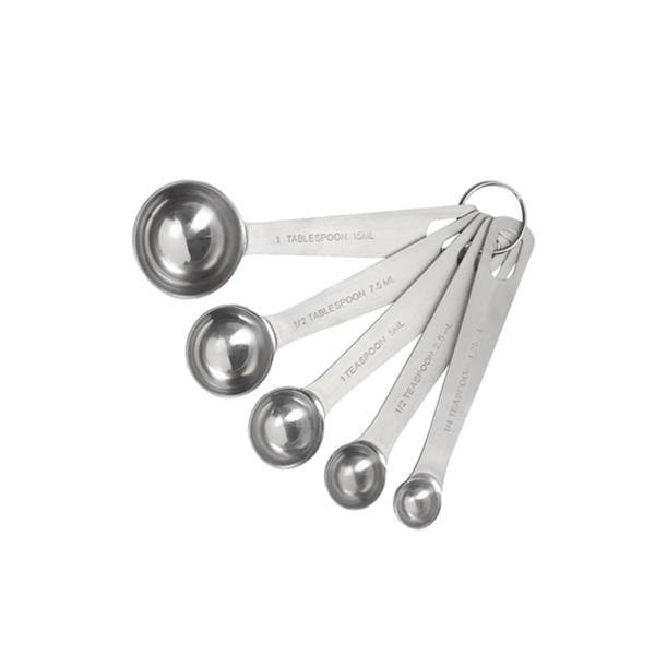 Set of 5 stainless steel graduated bakers measuring spoons.