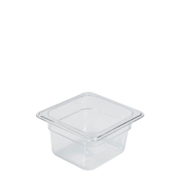 Clear polycarbonate gastronorm container 1/6 size 100mm deep.