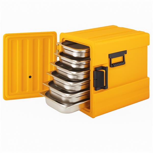 Front loading thermo box perfect for transporting hot or cold foods. Made of high-quality polypropylene with double-walled polyurethane insulation (CFC-free). Seamless insulation foam. Thanks to the very good insulation, the heat loss is less than 1.5 °C per hour. Max capacity 4 x 1/1 GN 100mm deep.